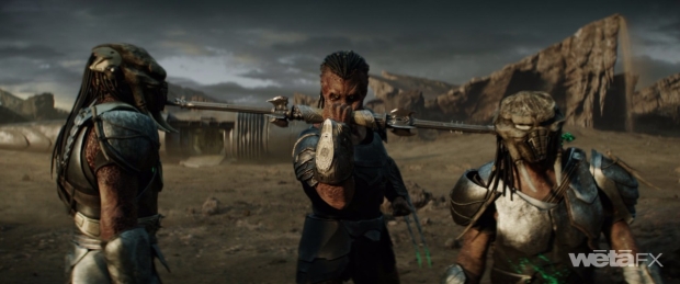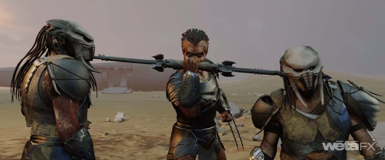 The planet of Yautjia Prime is the setting for a number of family member battles. “Initially, there was one quick samurai movement by Dek and Father was down,” reveals Rapley. “But after test screenings, Dan was looking at it and was like, ‘This needs to be more epic. Fathers should be the ultimate badasses. Dek needs work to take him down.’ Extra stuntvis was done. They came down to Wellington, got in suits, and motion captured it. We were doing extra previs beats, which was awesome. Just opening it up, letting it breathe and seeing these two people come towards each other with the homestead, Dek’s ship landing, and the sandstorm that followed Dek turning on the ship's thrusters. We were putting ideas like that on the table and Sheldon brought it to life beautifully.”