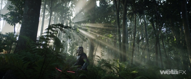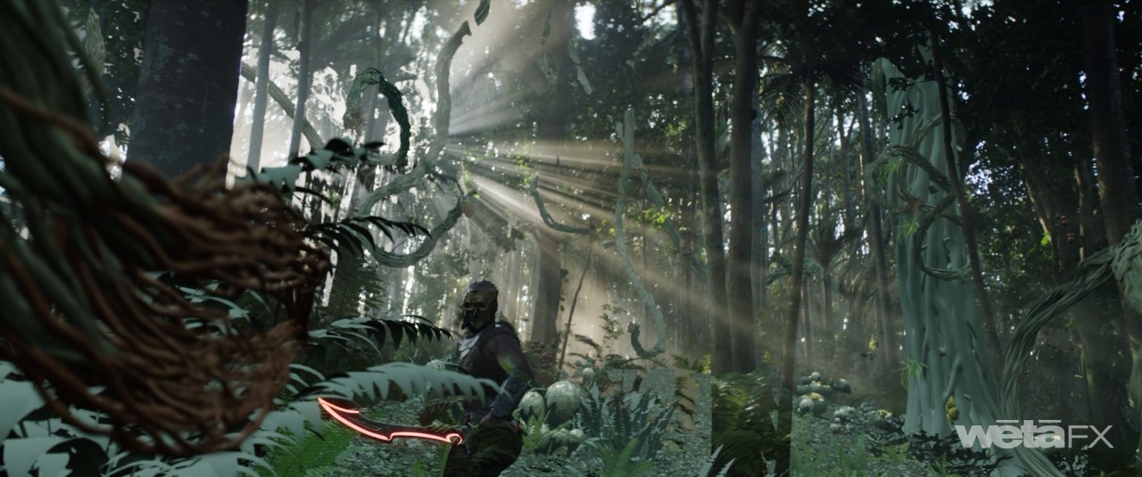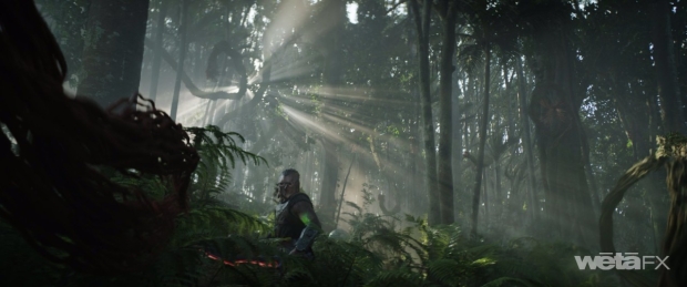 The design of the vines evolved throughout production. “It was an iterative process,” remarks Stopsack. “How saturated are the red tips? How detailed and broken up? How many leaves? Ironically, even though we embarked on this and thought we knew what we were doing, it actually ended up taking longer to really figure out what we're doing simply because we were still finding our movie with Dan. But it was a fun sequence because of the practical photography shot and filmed here in New Zealand, so you had an incredibly nice backdrop to start with. However, then you begin orchestrating the elephant trees and you start realizing, ‘In order to make this work, you have to embed them in this environment.’ You begin having to do interaction with vegetation and bushes, which is challenging because then you begin adding to it or replacing it. But where do you stop? Where are your split lines? Plus, we had the requirement for alien-esque trees and mushrooms. There was a huge amount of augmentation on top, so it was quite involved. You watch the movie and it goes by in a blink of an eye!”